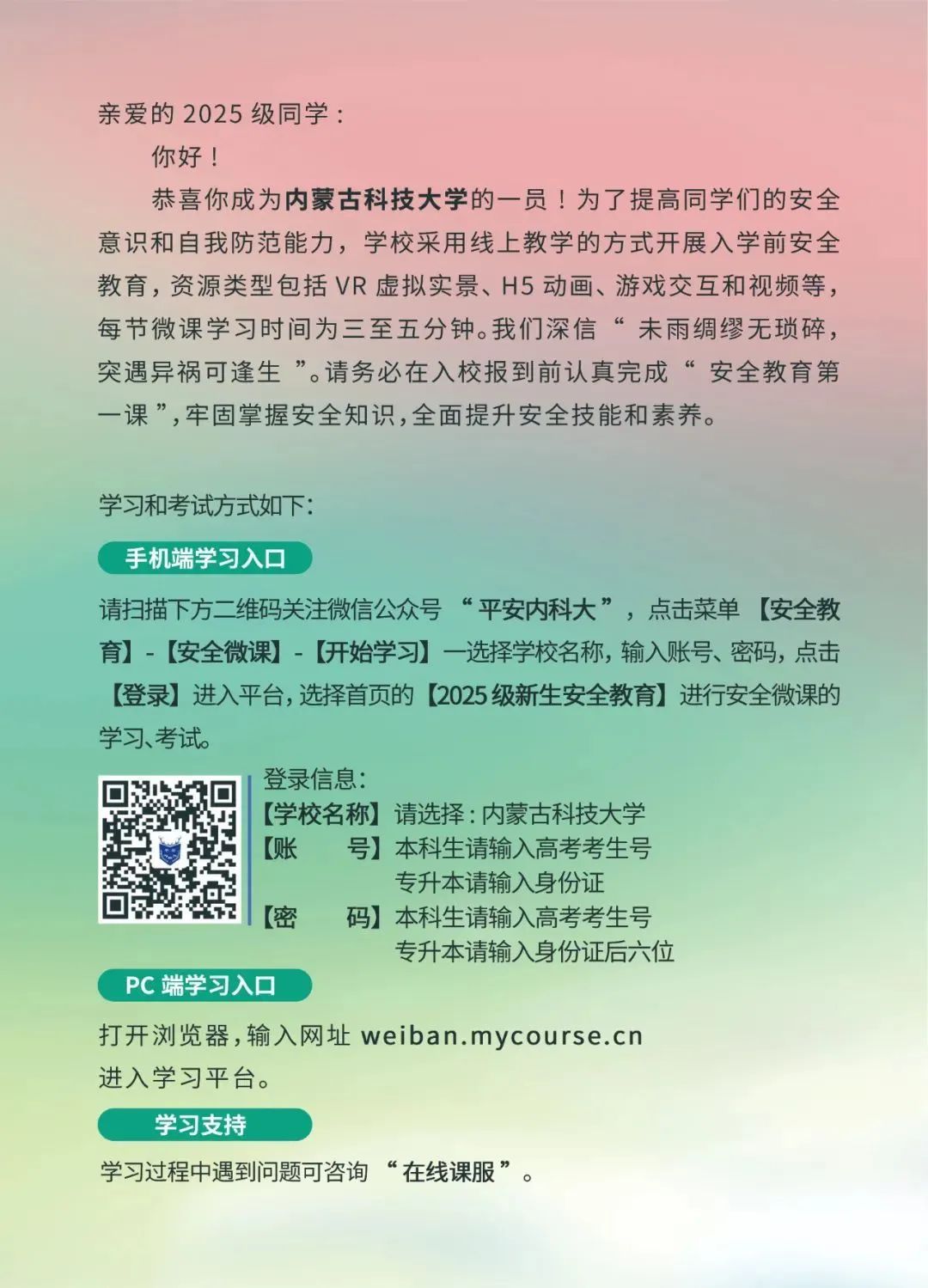 2025级新生安全教育微课开课啦 各位同学: 2025级新生安全教育微课已正式开课,请同学们按照学习通知书中的学习流程,选择登录方式进行学习和测试。祝愿每位同学的大学生活平安、健康。 温馨提示: 1.考生号不满14位的解决办法:请输入“25+身份证号前两位+考生号”。 2.其他无法登陆的情况可以在公众号留言,也可以直接联系安全微课在线客服帮忙解决。 平安健康是我们度过愉快的大学生活的基石,大家一定要好好学习安全知识,完成考试哦~