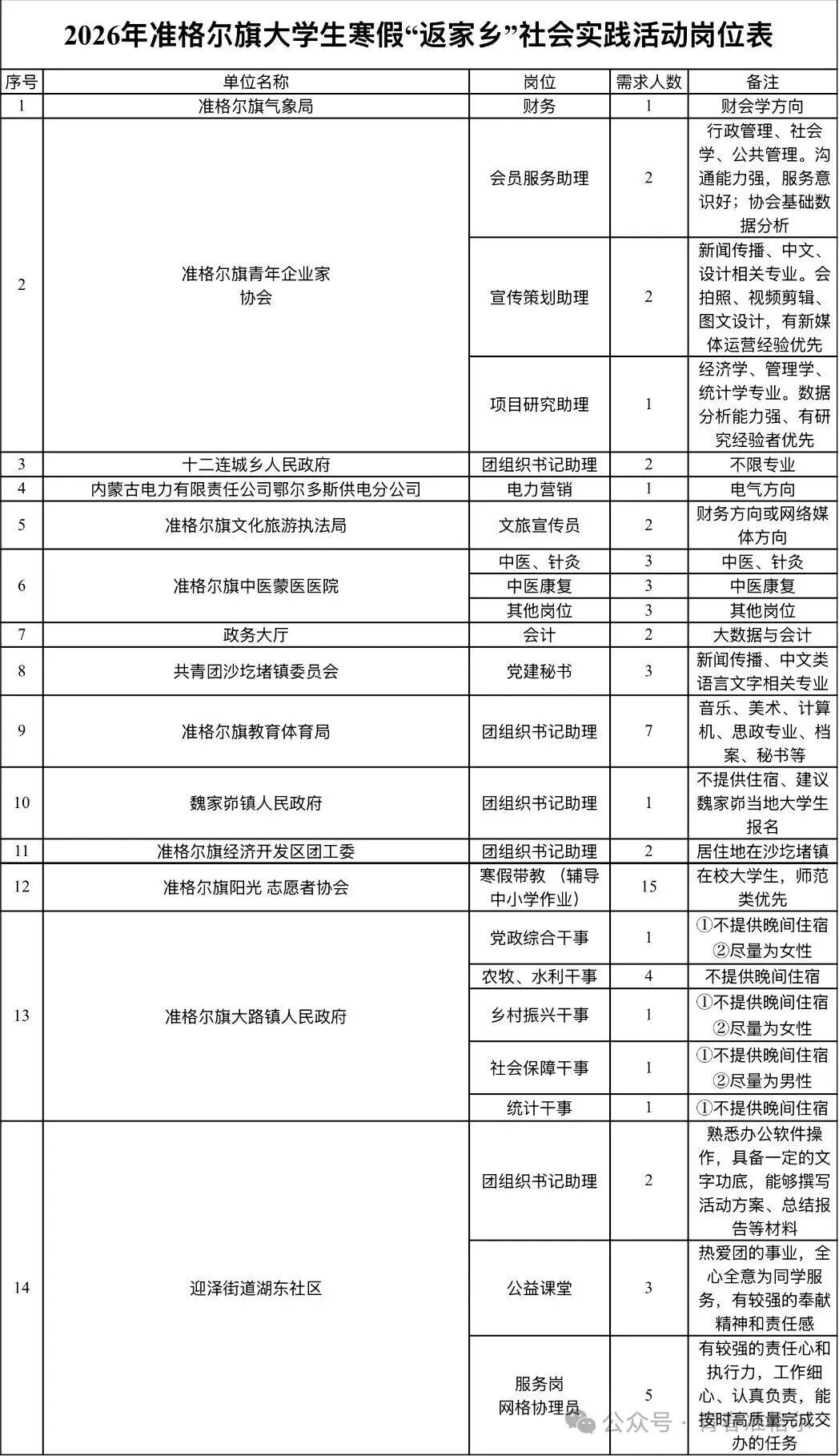 符合相关条件的大学生请根据《2026年准格尔旗寒假大学生“返家乡”社会实践活动岗位表》,就近选择意向服务单位。如有疑问可咨询团旗委学少部。